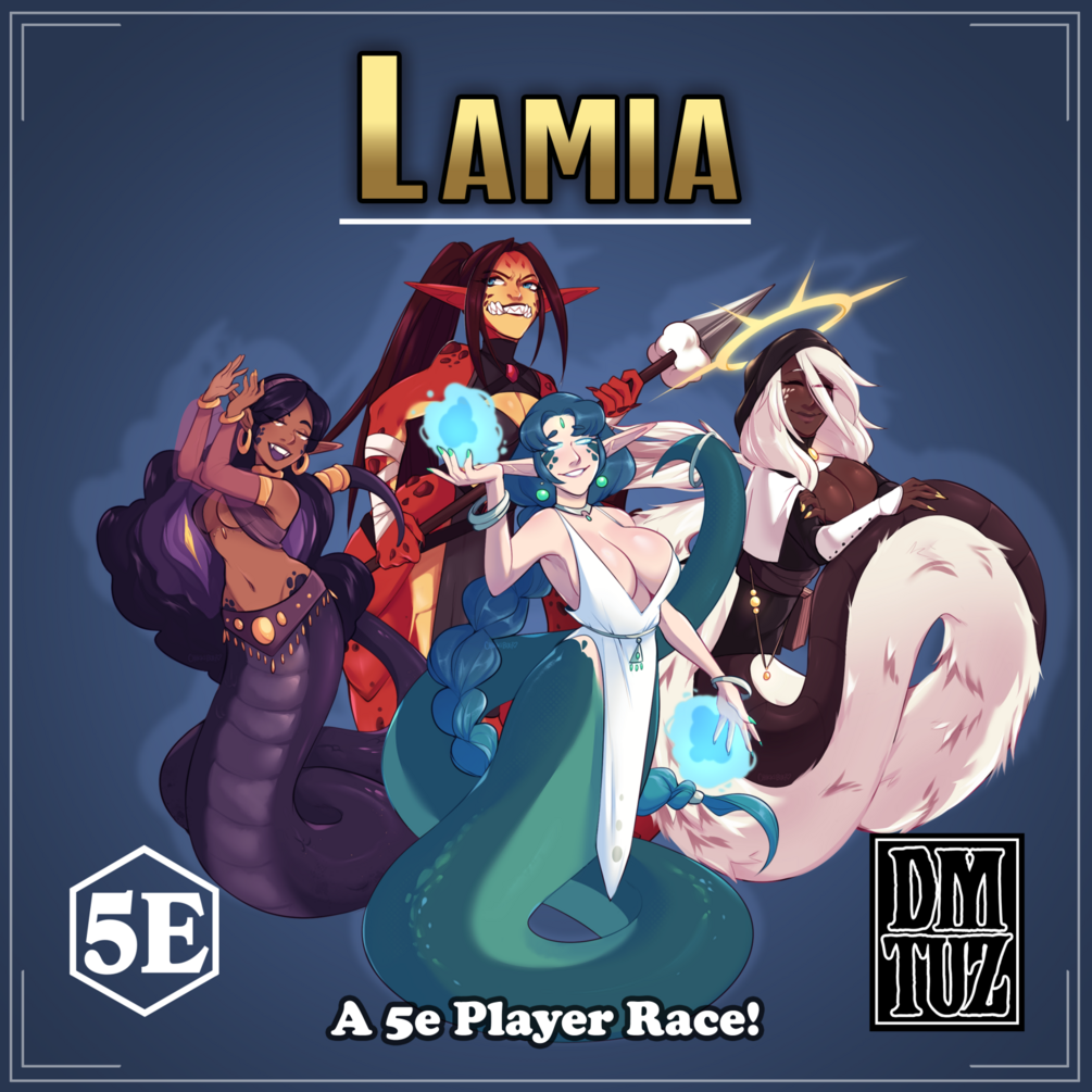 Get your hands on the new player race by DM Tuz in my series of Monster Girl races! Get options to play the Lamia and one of their 4 unique subraces, as well as full HD handouts of the featured art and Tokens for the Virtual Table Top platform of your choice!